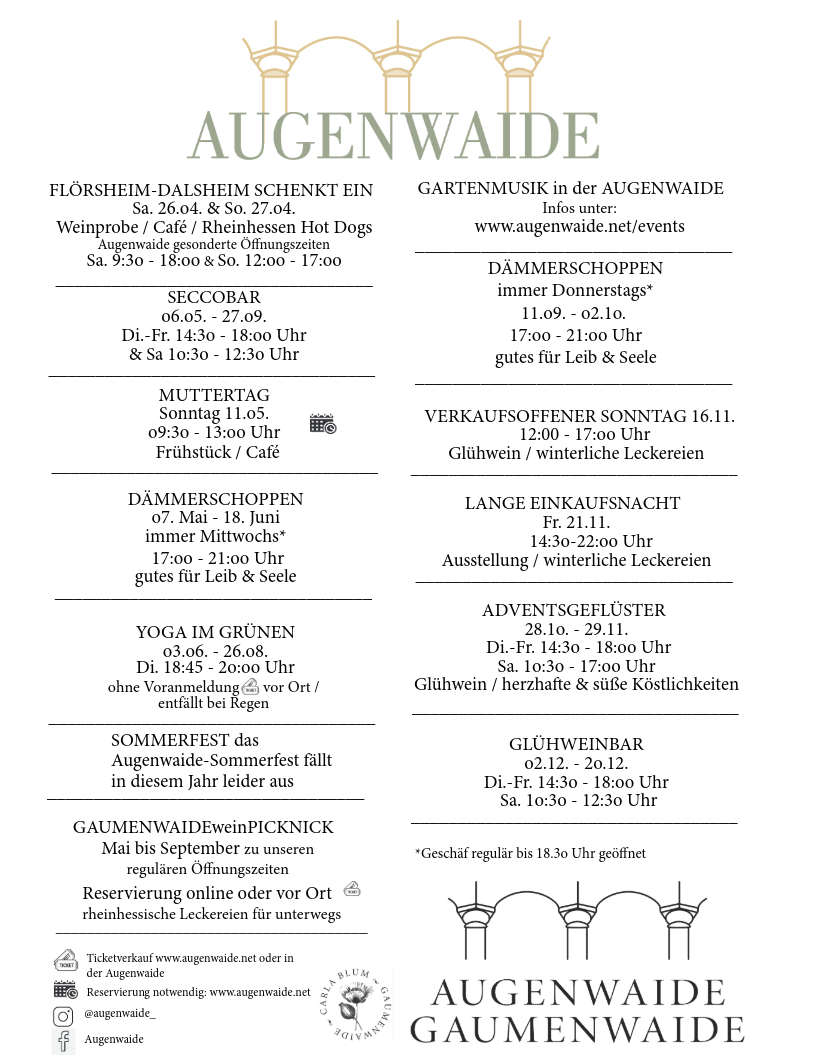 Genießen Sie unseren Glühwein und stöbern Sie in unserem Dekorationsverkauf nach einzigartigen Weihnachtsdekorationen und Geschenken. Unsere Gaumenwaide by Carla Blum serviert Ihnen weihnachtliche Köstlichkeiten, die perfekt zu unserem Glühwein passen. Verbringen Sie eine gemütliche Zeit mit Freunden und Familie und genießen Sie die festliche Atmosphäre in unserem Zelt. Der Adventsverkauf bietet eine breite Auswahl an Weihnachtsdekorationen und Geschenken. Kommen Sie vorbei und erleben Sie mit uns das Adventsgeflüster in der Augenwaide. Wir freuen uns darauf, Sie bei uns begrüßen zu dürfen!